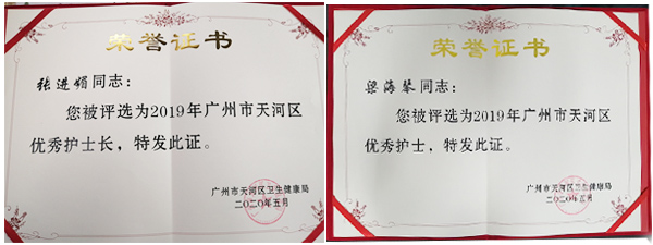 张进媚主任获天河区优秀护士长       梁海琴护士获天河区优秀护士
