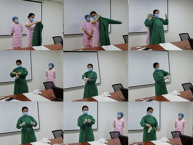 官护长为大家演示如何穿无菌衣和防护服,如何佩戴无菌手套