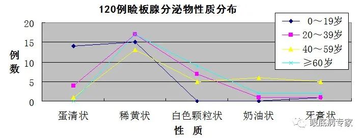 结果:患者组睑板腺分泌物呈牙膏状18例,2例儿童,1例因瞬目过多就诊,另 1例无主诉;成人无症状1例,余下15例患者有以下1个或几个症状(括号内为出现频率):眼部异物感(6)、流泪(6)、眼红(4)、分泌物多(3)、胀感(3)、刺痛感(3)、畏光(2)、干涩(2)、灼热感(1)、眼睑痉挛(1)。症状持续时间6个月至10年不等。按压出睑板腺牙膏状分泌物后,主诉症状明显减轻15例。连续120例门诊调查组中,完全是蛋清状睑板腺分泌物,0~19岁组14例和在20~39岁组4例,其他年龄组主要以稀黄分泌物为主。在40~59岁组,牙膏状分泌物最多,有5例,到≥60岁年龄组又下降(图2)。7 例睑板腺分泌物涂片