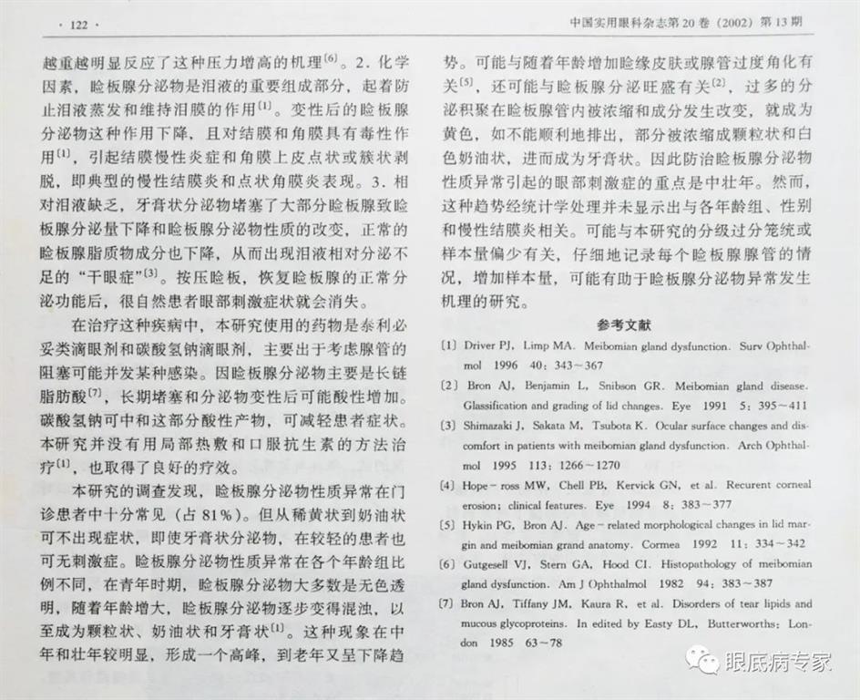 1. 刘文,白宁艳,陈家祺,刘祖国,陈龙山,郑湖玲.睑板腺分泌物性质异常与眼部刺激症.中国实用眼科杂志,2002,20(13):119-122.