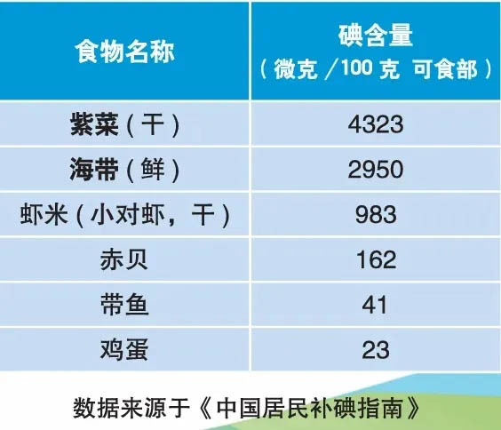 不同食物的含碘量不同,部分海产品含碘量较高,其中紫菜、海带的含碘量最高。
