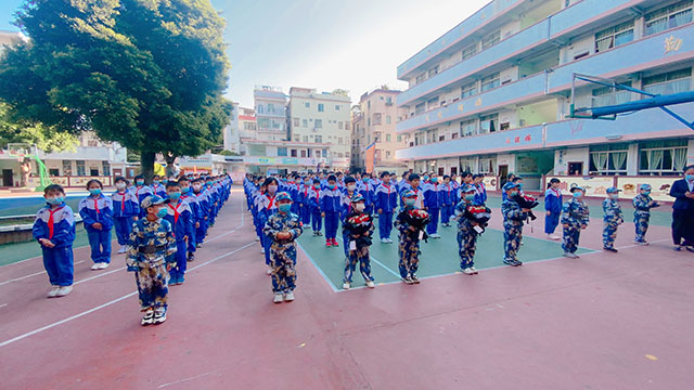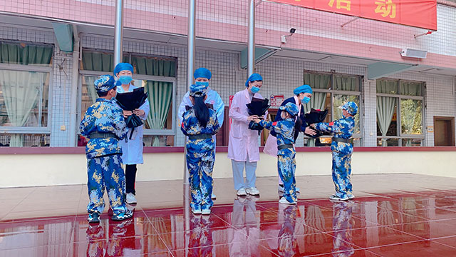 2021年11月10日下午,广州市同仁天兴学校的师生们排着整齐的队伍,派出多名学生代表为忙于一线新冠疫苗接种的医护人员献上鲜花和祝福。11月9日、10日,广州华兴康复医院响应广州市天河区卫生健康局号召,在广州华兴康复医院护理部主任张进媚带队下,派出五名医护团队在同仁天兴学校校园内开设疫苗接种专场,两天共接种了750人,有序、安全、高效完成了该校3-11岁儿童新冠疫苗首针接种任务。